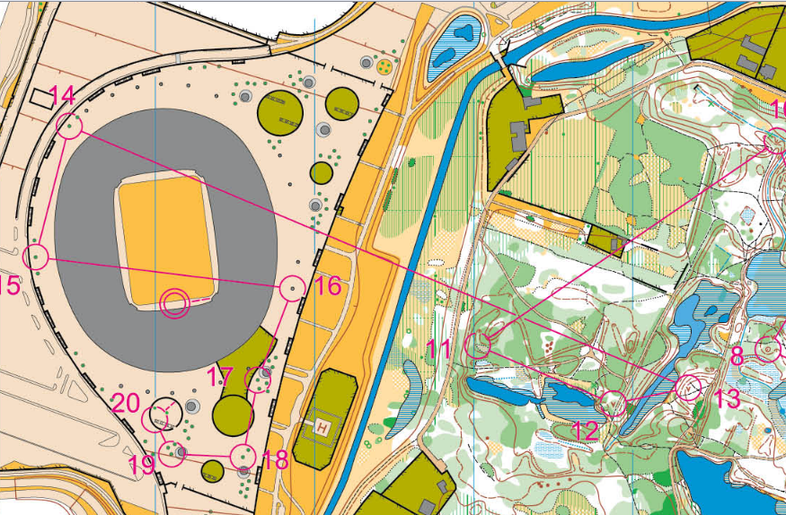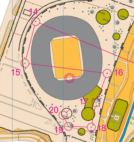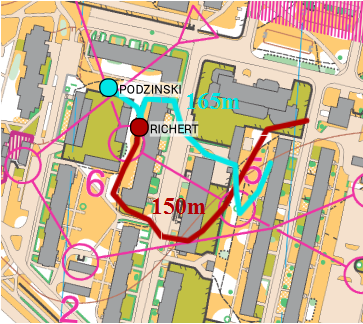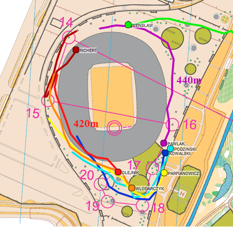 Ostatni wariant do wyboru na trasie to dobieg do punktu nr 16. Można było omijać stadion od północy albo od południa. Większość zawodników wybrała wariant południowy (który okazał się krótszy), na wariant północny zdecydował się Pawlak oraz Richert. Jak można zauważyć na międzyczasach obaj trochę stracili do najlepszych na tym przebiegu.