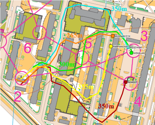 Pierwszy ciekawszy przebieg to dotarcie do punktu nr 3. Ja osobiście przed obejrzeniem GPS-ów wybrałem 3 możliwe warianty. Jak się okazuje, mimo iż z nadajnikiem GPS biegało tylko 8 zawodników, wybrali oni aż 5 różnych wariantów. Najszybszym wariantem zdaje się być przebieg wybrany przez Mateusza Wensława. Ten sam wariant wybrali także Pawlak, Kowalski oraz Olejnik. Jednak najkrótszym wariantem okazał się być ten wybrany przez Kamila Włodarczyka, który do Wensława stracił na omawiany punkt 4 sekundy. Pozostałe warianty wydają się być już znacznie gorsze.