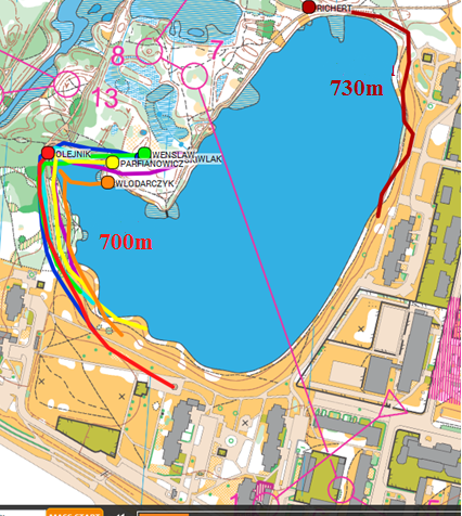 Na PK nr 7 istniały dwa wybory: omijać jezioro z prawej strony albo z lewej. Przytłaczająca większość zawodników wybrała wariant z lewej. Tylko Marcin Richert z zawodników posiadających GPS wyłamał się i pobiegł od prawej. Wcale na złe to mu nie wyszło, ponieważ uzyskał na tym przebiegu drugi czas, tuż za Wojtkiem Kowalskim. Trzeba pamiętać, że był to dosyć długi przebieg, dlatego należy wziąć również pod uwagę różnicę w prędkości poruszania się poszczególnych zawodników. Można założyć, że oba warianty były porównywalne, a najszybciej pobiegł ten kto miał „najwięcej pary w nogach”.