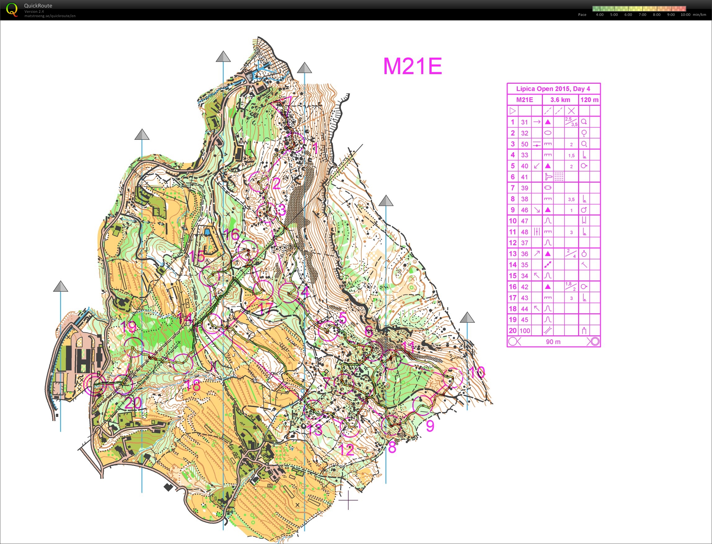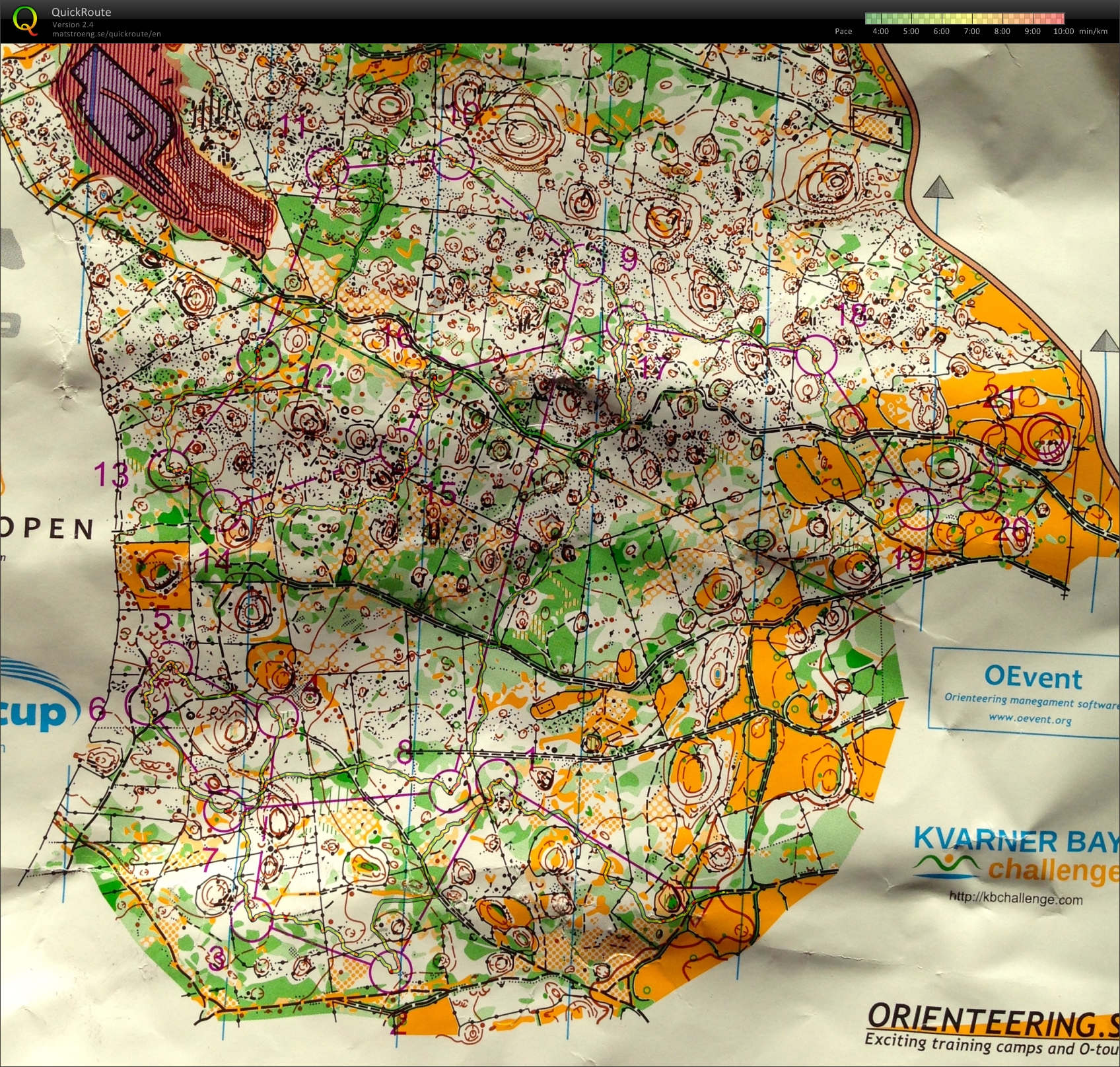 Kolejny etap zapowiadał się bardzo przyjemnie. Teren górzysty po połowie trasy zmieniał się w teren półotwarty z dużą ilością zielonych elementów. Postanowiłem przed biegiem, że chcę wreszcie pobiec płynnie, dobrze wchodząc w bieg i kontynuując to w drugiej części. Na niektórych przebiegach chciałem również przyśpieszyć, żeby sprawdzić jaką prędkością muszę biegać by wygrywać. O ile pierwsze założenie spełniłem, dzięki czemu udał mi się równy, dobry bieg z małymi błędami, o tyle myśl o przyśpieszeniach zaniechałem po pierwszej próbie. Suma summarum zająłem dobre 7 miejsce.